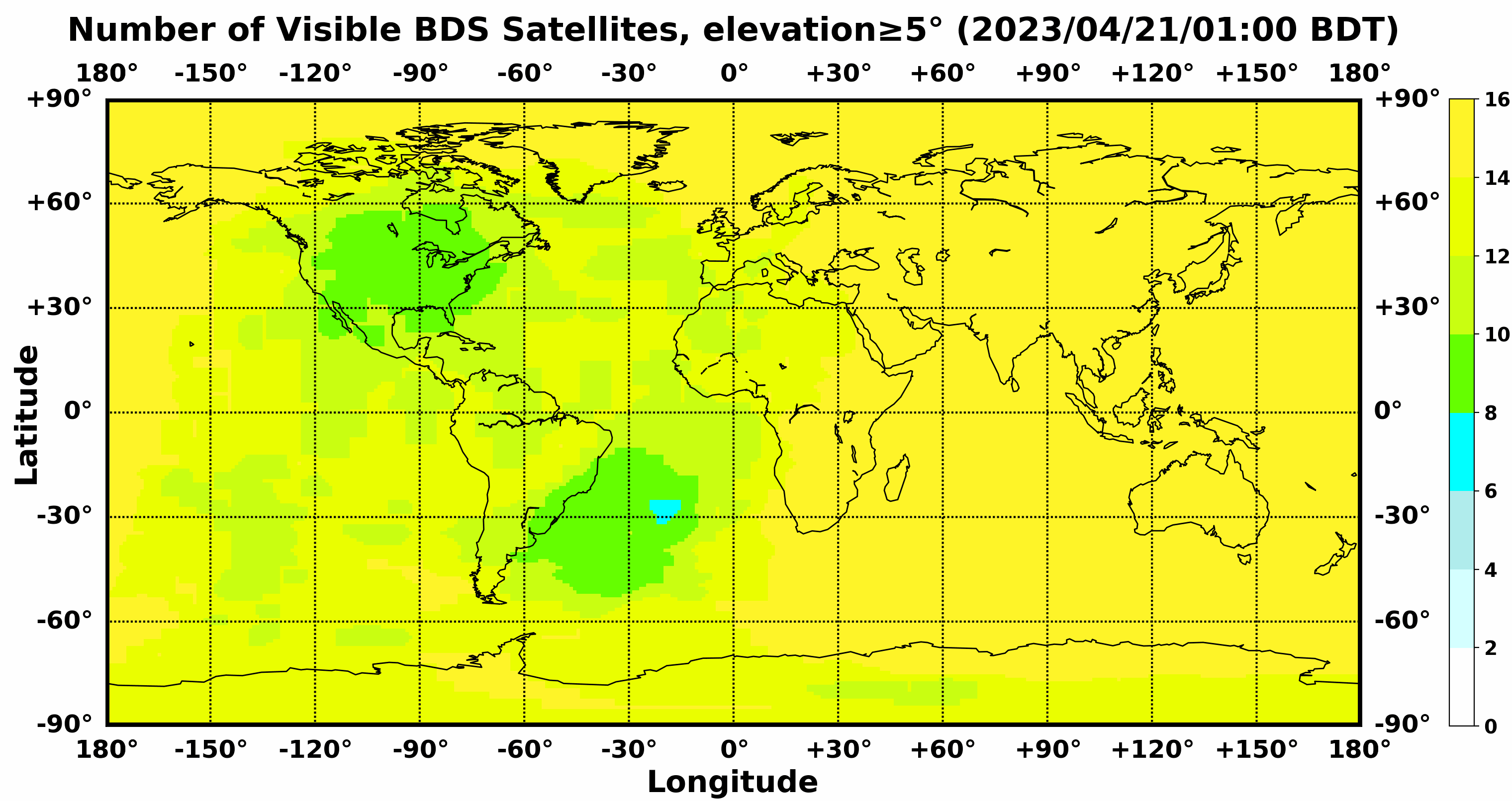 此处显示的是北斗卫星导航系统在全球任意地点可以看到的卫星数目,用不同颜色表示不同数值(颜色与数值的对应情况参见右侧的图例)。