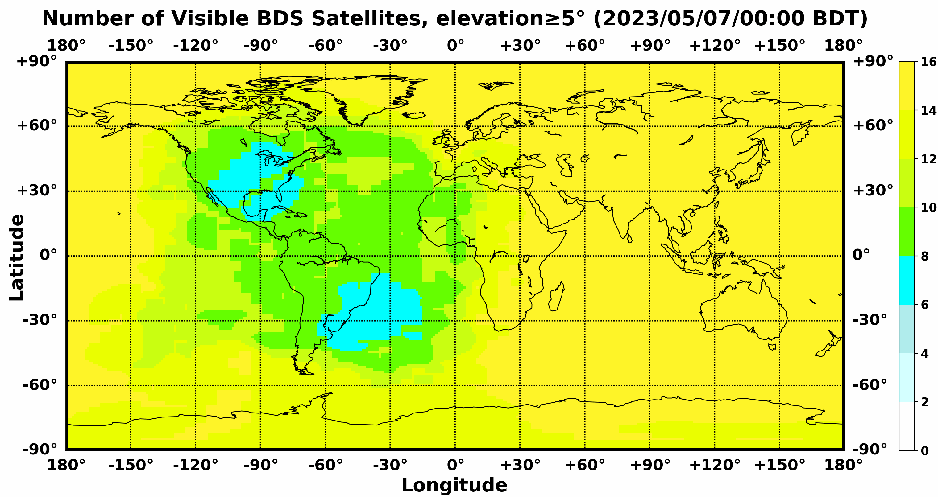 此处显示的是北斗卫星导航系统在全球任意地点可以看到的卫星数目,用不同颜色表示不同数值(颜色与数值的对应情况参见右侧的图例)。